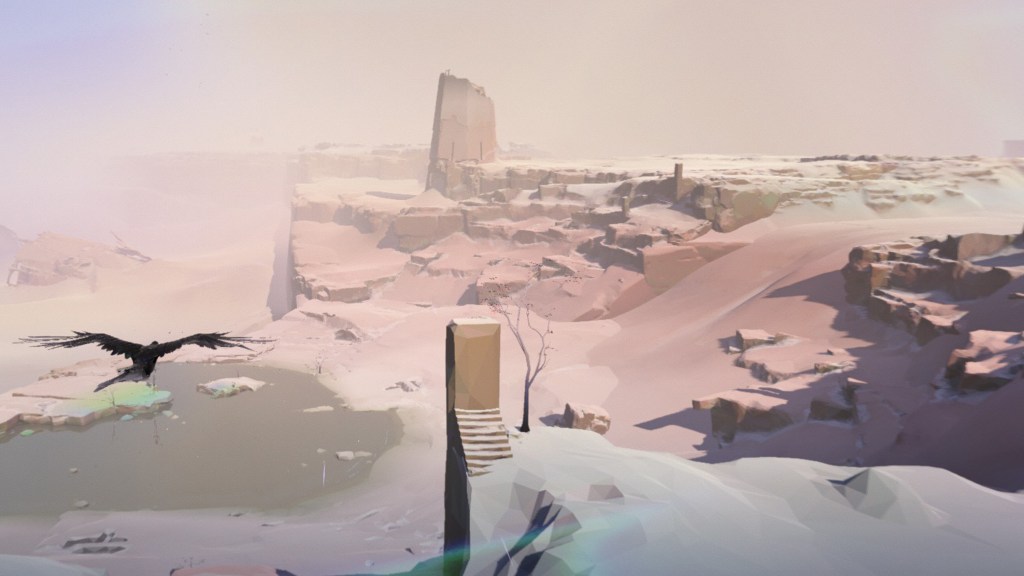 Following the chaotic introduction, the player takes the form of a bird, with the freedom to explore a large, sweeping desert vista complete with tall, red stone cliffs, valleys, and the occasional scattered oasis. It soon becomes clear that this dying landscape is all that remains of the civilization and buildings shown before. I found this section of the game to be the most visually stunning and fun to interact with. The experience of taking flight with a bird has successfully been done before (AER Memories of Old and Copoka spring to mind), however I found the visuals to be smooth and enchanting, and I spent longer than I should have soaring between rock formations and exploring the environment.